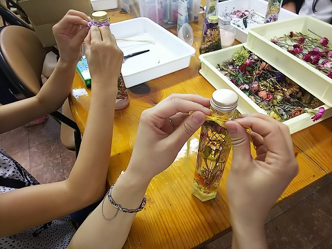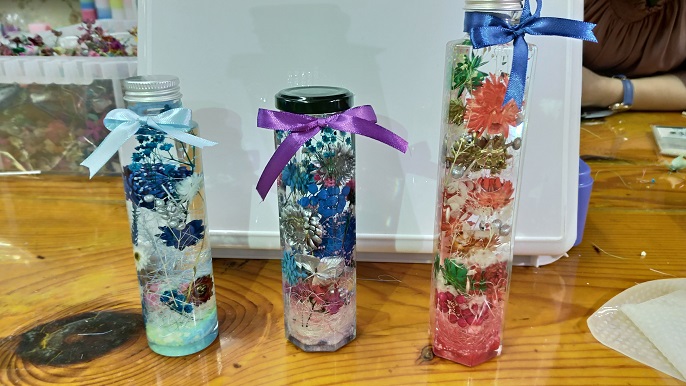 【ポイント】ハーバリウムは液体を注ぐと、お花が大きく、濃く見えます。沢山花材がありますのでつい色々入れたくなりますが、メイン・サブメインのお花を引き立てるようにボトルの6割くらいを目安に入れると綺麗に出来ます。少ないかなと思っても、後からお花は膨張して大きく見えます。