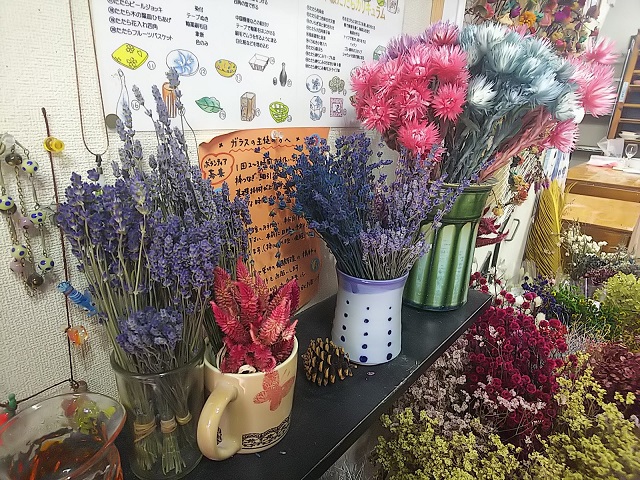 ・少人数制のレッスンで、ハーバリウムの制作から取り扱い・お花の知識・注意事項まで、お仕事にするために必要な知識を全て学ぶことができます。また、希望者には仕入れ先のご相談。後日、大須の花き市場に仕入れの付き添いを致します(朝6時頃)