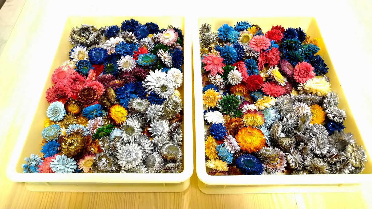 お花は300種類!鈴鹿工房のお庭で取れた季節の花や名古屋の市場で美しいお花を厳選し、自家製で1つ1つ手作業でお花をドライ加工+着色していますので多種類をお値打ちに提供しております。