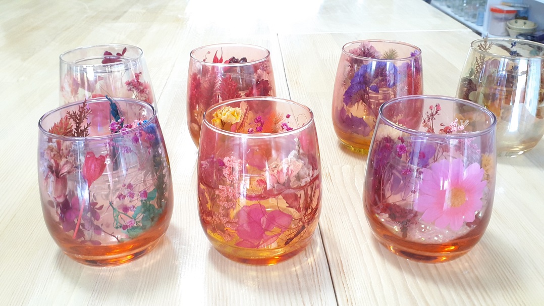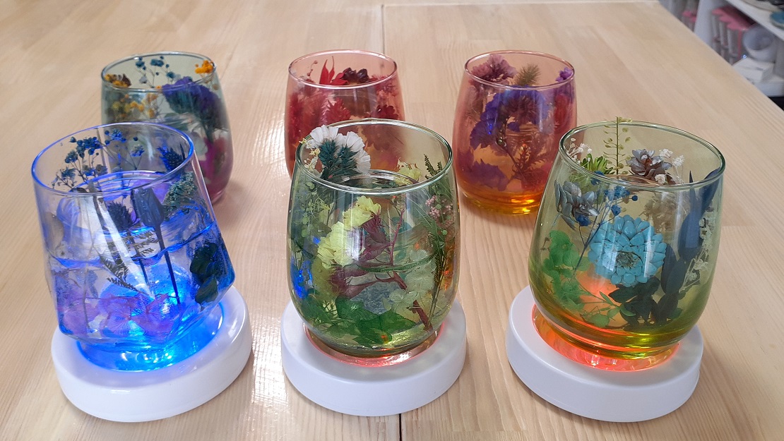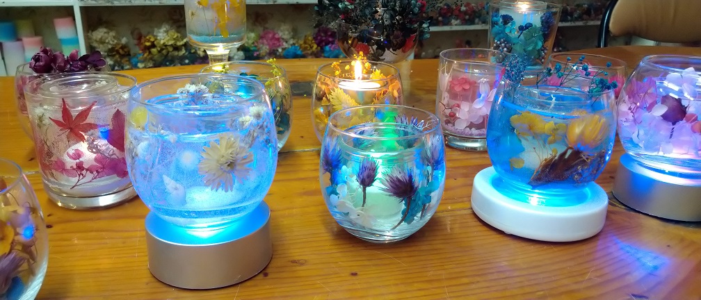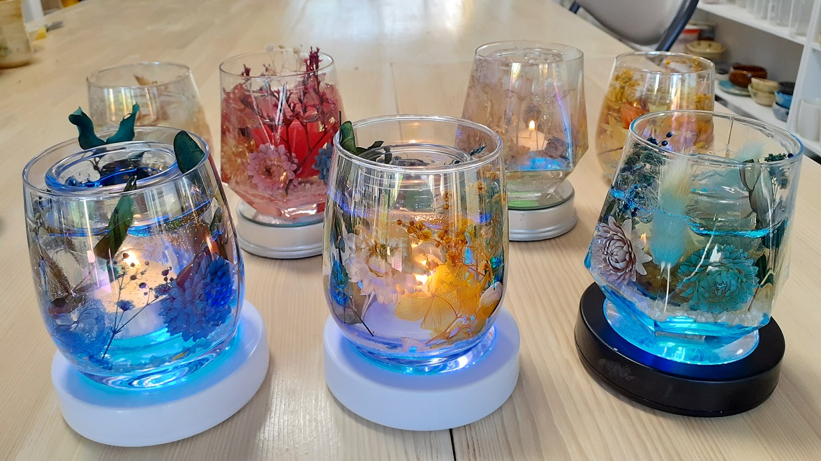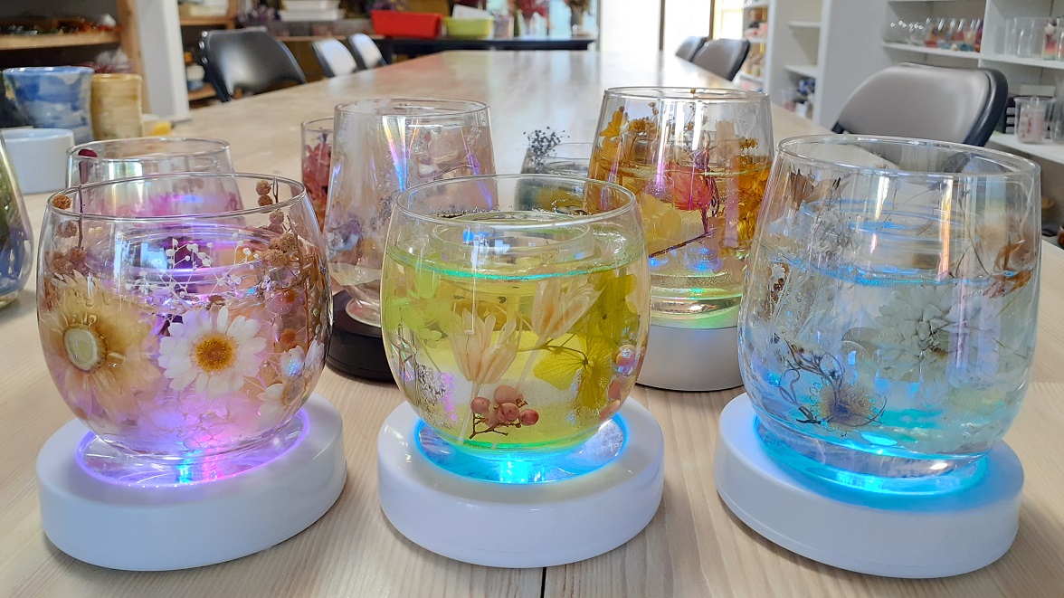 体験は失敗がない仕様になっております。ガラスのコップが中に入っており隙間にお花を詰め、蝋を流し込みます。中にライトを入れます。透ける光が綺麗です