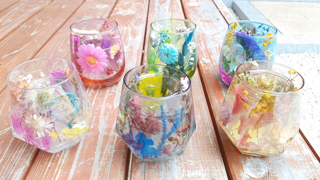 【制作するもの】 透明なジェルキャンドル1個。土台のガラス器を2個選び、ガラスとガラスの間の隙間に大きなものからお花を入れ、隙間にも立体花を入れていきます。そして120度のジェルを流して固定します。泡が出て綺麗!真ん中に別のキャンドルやLEDライトを入れます。当日お持ち帰り出来ます。2名様から【料金・時間】 3800円 / 90分 ろうそく1個付き 器大/4200円/ 90分