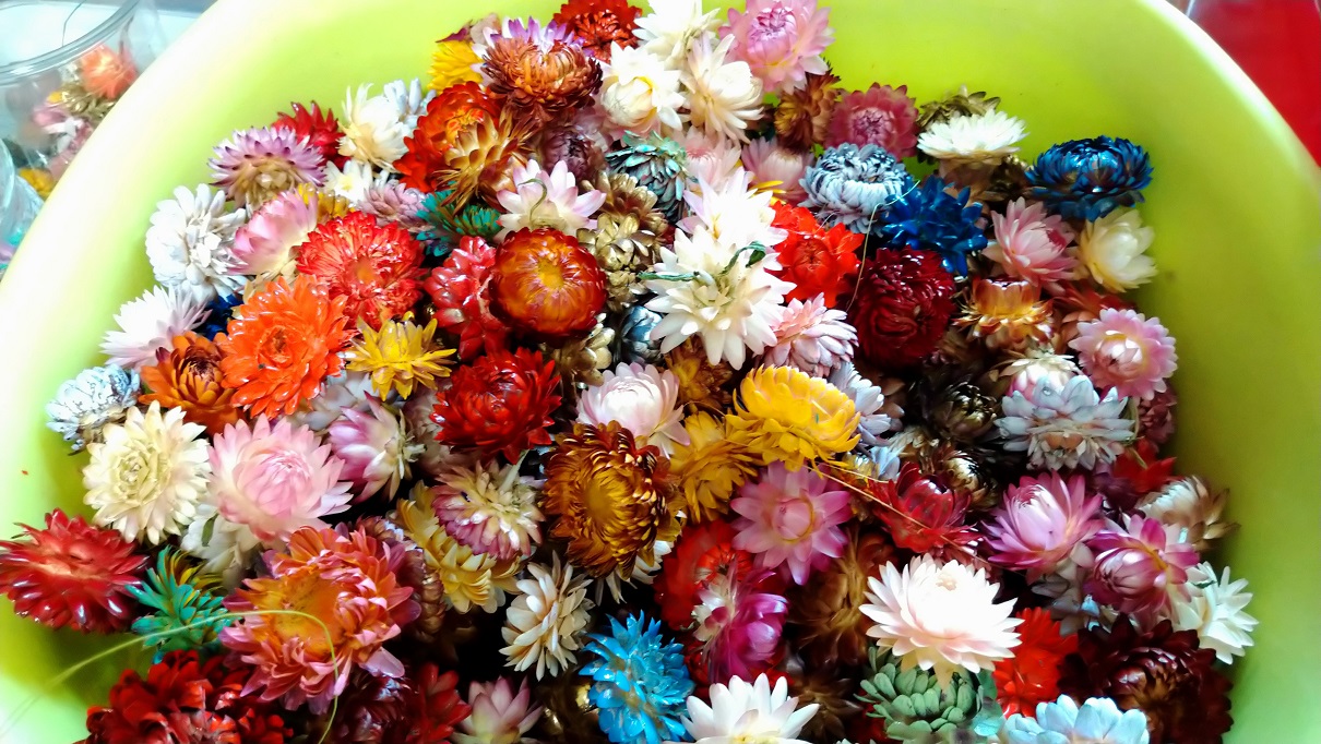 お花は、鈴鹿工房のお庭で取れた季節の花や名古屋の市場で美しいお花を厳選し、自家製で1つ1つ手作業でお花をドライ加工+着色していますの多種類をお値打ちに提供しております。
