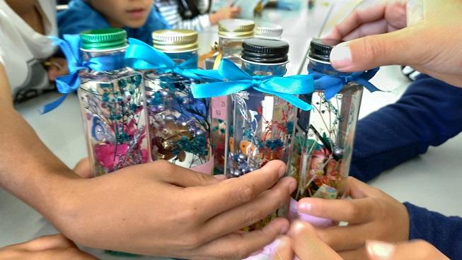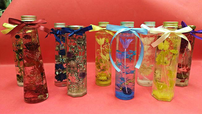 ハーバリウム出張体験の1例です。毎回会の趣旨に合わせて内容を変えています。~100名迄