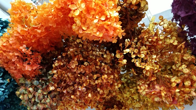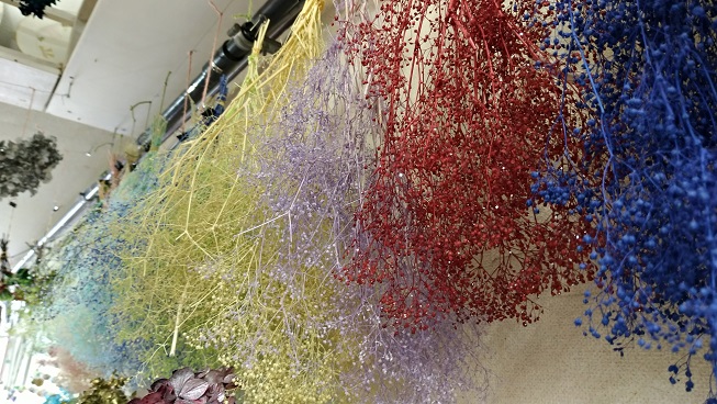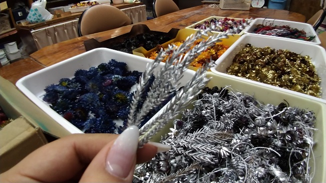 【メイン花】ヘリクリサムB~Cグレード、千日紅B、どんぐり木の実B他 【サブ花】タタリカA、あじさいB、カスミソウB、その他小花B。枝物、スギ、葉物、他40種類 。*一番下の色砂は10種類以上あります。