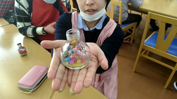 季節のお花は入れ放題+動物や魚のシールをフィルムに貼りボトルの中に入れていきます。楽しいタイプのハーバリウムです。リボン付き。当日お持ち帰り出来ます。