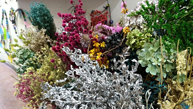 【メイン花】バラC、ヘリクリサムBグレード、千日紅B、ベリーBどんぐり木の実A他 【サブ花】タタリカA、あじさいA、カスミソウB、メタセコイヤ・ブナ、その他小花B、枝物、葉物他80種類
