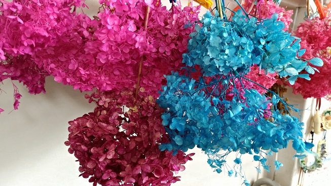 ここちよのは、自然には少ないピンク、青系のお花を自家製で500種類程作っています。男性やお子様にも向くように考えて年中違うお花を意識して作ってます。そんな自家製のお花からボトルフラワーを手作りしませんか?「ハーバリウム」は、お部屋に飾れるインテリアアイテムとしてここ数年注目を集めています。瓶の中に専用のオイルを入れ、中にドライフラワーやプリザーブドフラワーを詰め放題。また、男の子用にも合うように、男性向きの花材も沢山用意してます。瓶やキャップ、リボンの色も数十種類の中から選べます。中々ないバラを使ったハーバリウムもできますよ。