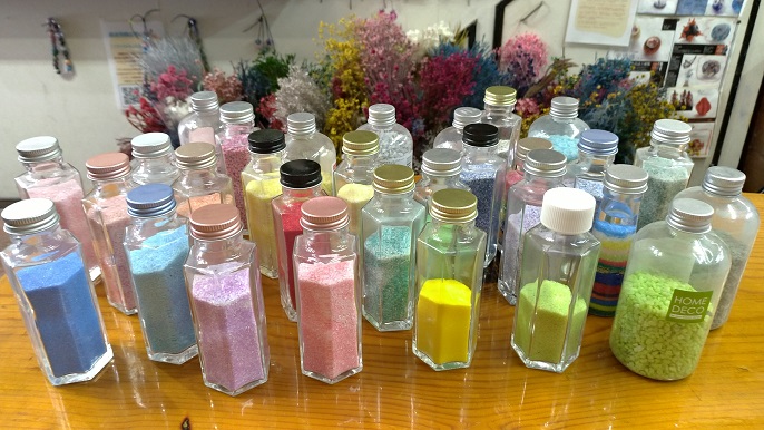作り方・・下の方から色々な花材をボトルに詰めていきます。一番下は沢山ある砂から30色位↑。混ぜてもいいし、1色でも綺麗です。次に小さな花。枝物、最後にメインのお花を入れて完成です。