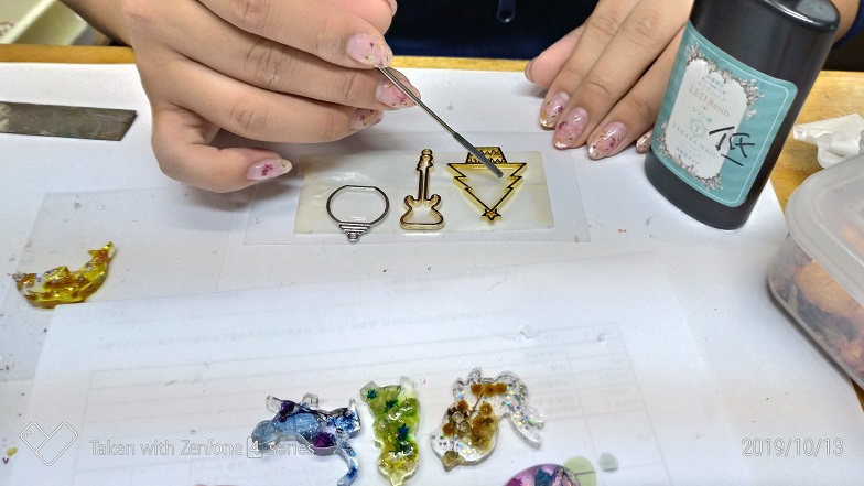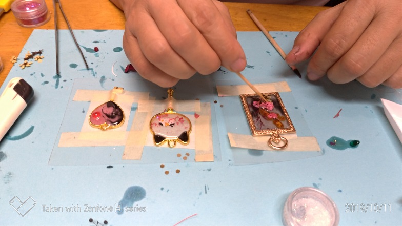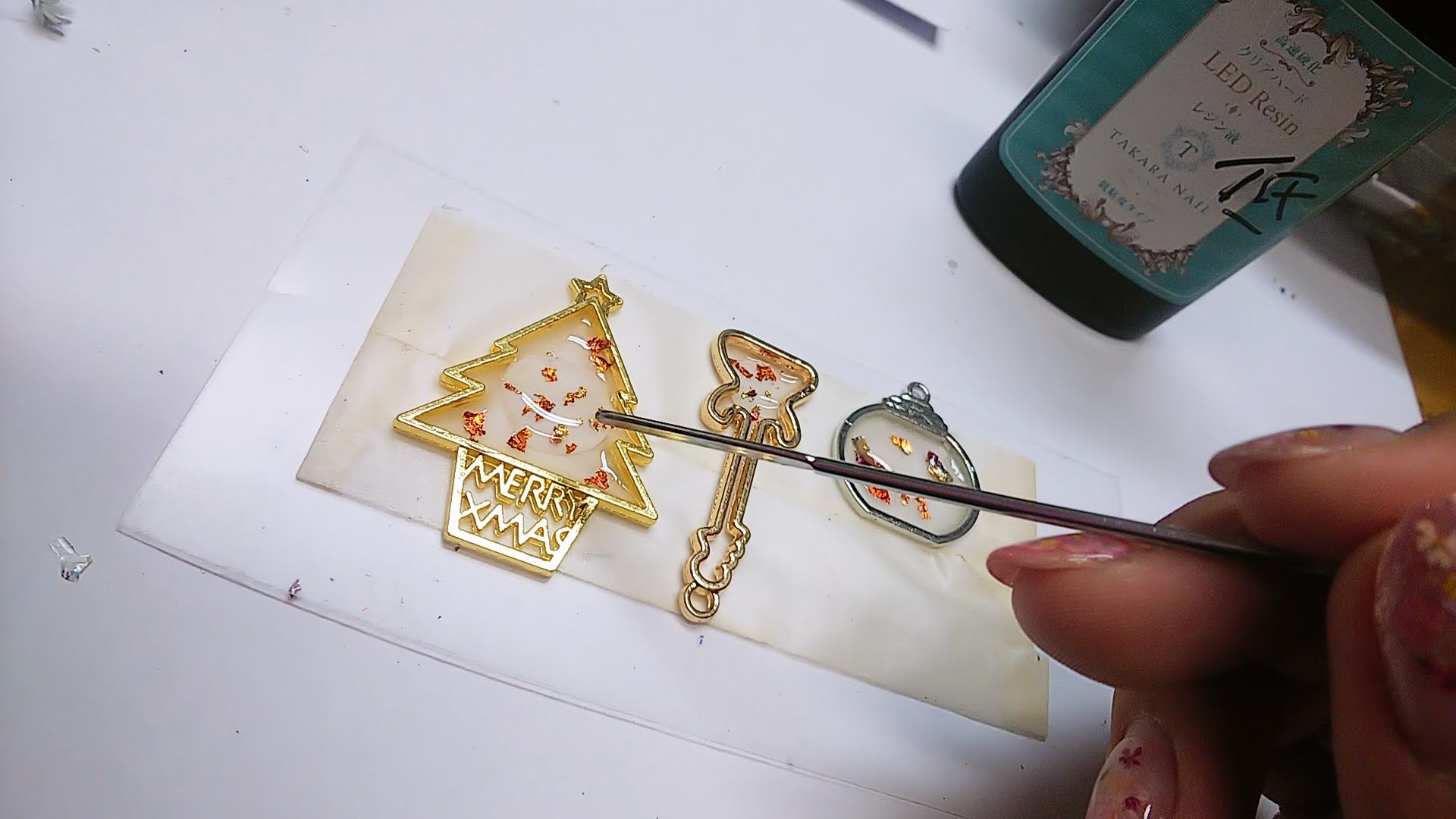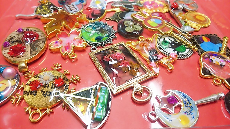 作り方・・【流れ】 ①レジンの作り方の説明をします。10分。②土台を選びます。*沢山ありすぎて、迷うことが楽しいようにしてあります。③型にレジンを引き、バックを色付けます。④1度乾かしお花、シール等を載せます。⑤3層目のレジンを入れ金、銀箔、ラメ等を載せます。紫外線で乾かします。⑥型から外し、仕上げをして組み立てて完成です。(標準3回仕上げ)