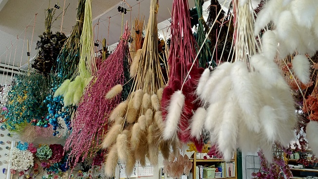 | Bプラン2000円。花材が豊富。 | 【メイン花】ばら、あじさいA、カスミソウ、千日紅B、どんぐり木の実他 【押し花】カスミソウ、あじさい他30種類 |