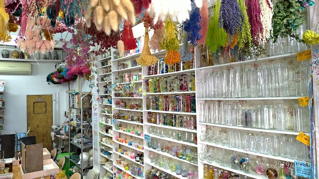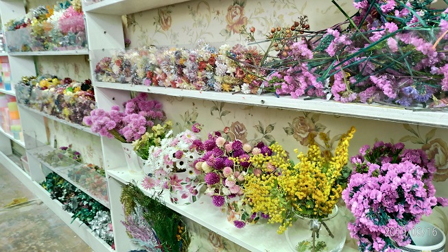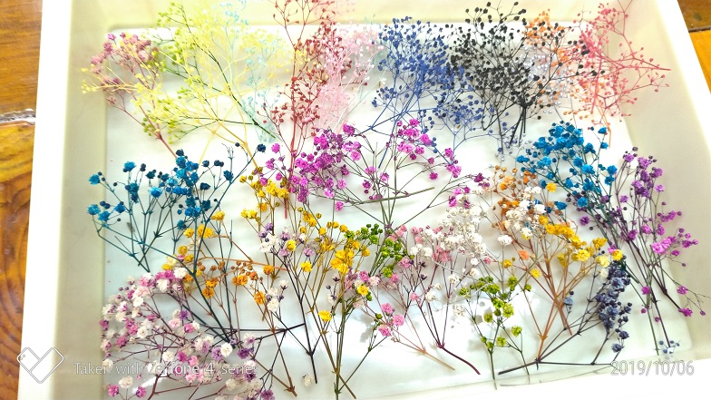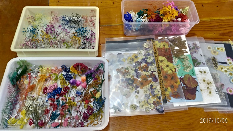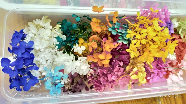 レジンによく使う小花は約100種類!津島工房のお庭で取れた季節の花や市場で美しいお花を厳選し、自家製で1つ1つ手作業でお花をドライ加工+着色していますので多種類をお値打ちに提供できております。また、お花シール等(1000種類以上)もとてもキレイでたくさんあります。ご要望に合わせてお持ちします。