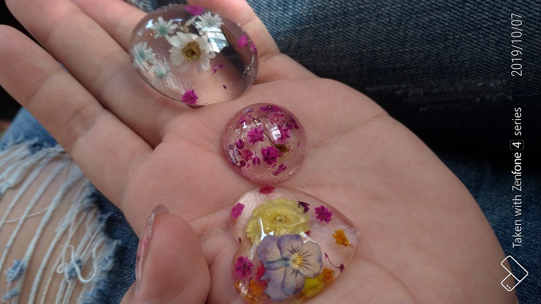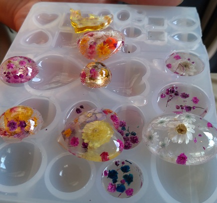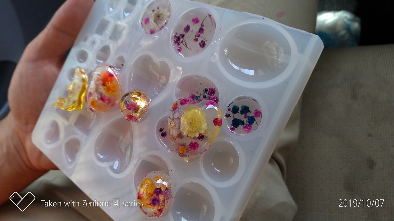 【内容】個人体験と同じ内容です。型を2つ選び、レジン液を入れバック模様から選んで入れます。1度乾かし、メインの花やシールを貼りまたレジンを載せ、乾かし、最後にもう1層レジン液を塗りラメやシェル等載せます。基本3層で作ります。初心者向きにキレイなレシピ作ってあります。