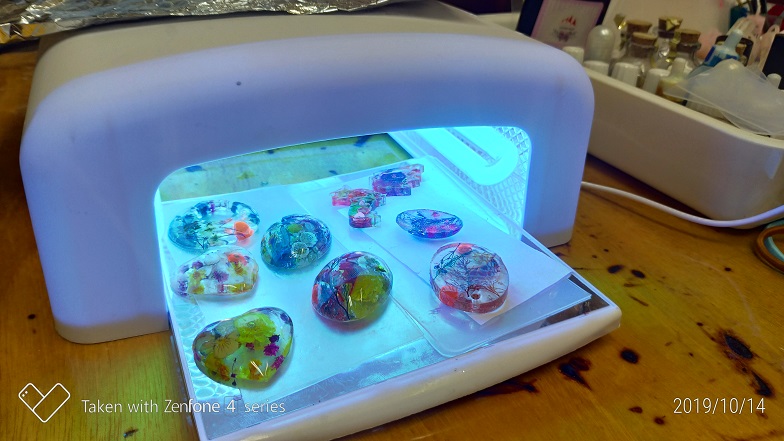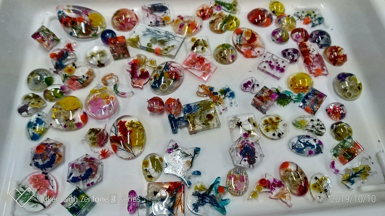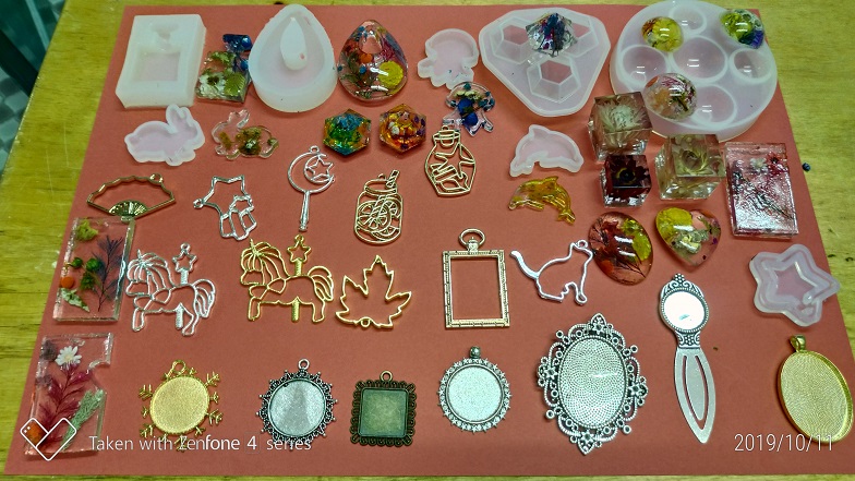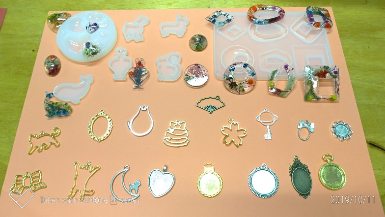 【流れ】 ①レジンの作り方の説明をします。10分。②土台を選びます。*沢山ありすぎて、迷うことが楽しいようにしてあります。③型にレジンを引き、バックを色付けます。④1度乾かしお花、シール等を載せます。⑤3層目のレジンを入れ金、銀箔、ラメ等を載せます。紫外線で乾かします。⑥型から外し、仕上げをして組み立てて完成です。(標準仕上げ)
